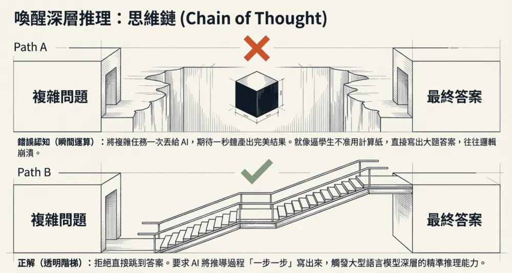 「思維鏈」的核心概念,就是要求 AI 不要直接跳到答案,而是把推導過程一步一步寫出來。