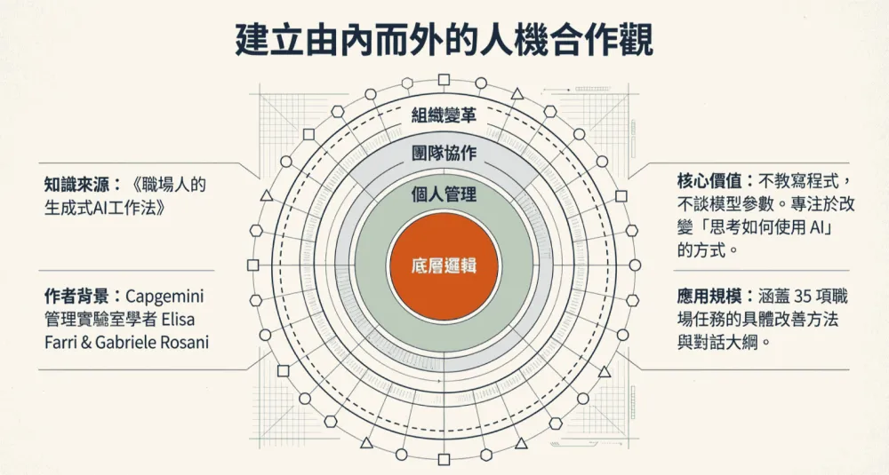 這本書的結構設計得很像一張「由內而外」的實戰地圖。《職場人的生成式AI工作法》是從最底層的 AI 素養觀念開始,先幫我們建立正確的人機合作觀,然後再幫我們建立使用方法 。