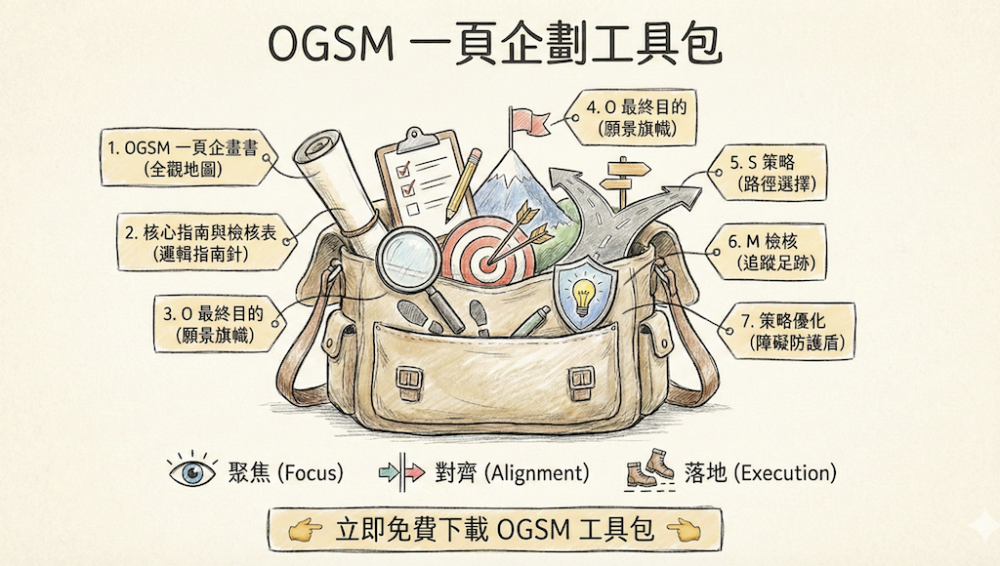 如果你對於撰寫OGSM有興趣,我製作一份 OGSM 的 一頁企劃書工具包 ,包含四個部分 :