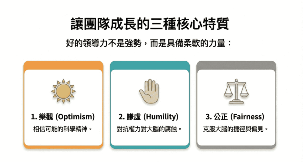 領導者要用樂觀去構建容錯的創新機制,用謙虛去維護開放的大腦與組織環境,用公正去克服人性的偏見並贏得信任 。