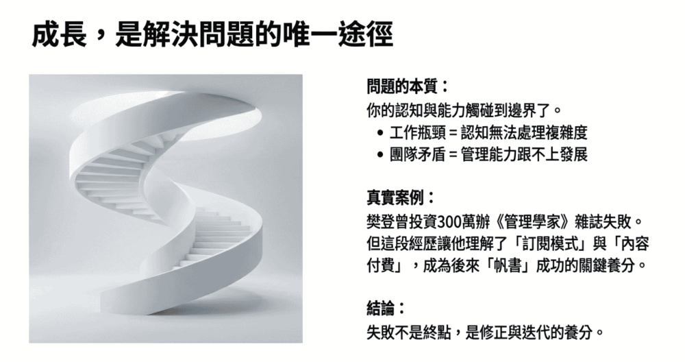 如果我們停下腳步,外部環境(競爭對手、技術變革)依然在加速,我們與世界的差距會被拉大。因此,成長不是一種選擇,而是解決眼下困境的唯一途徑,是突破認知天花板、擴大解決問題能力的過程 。