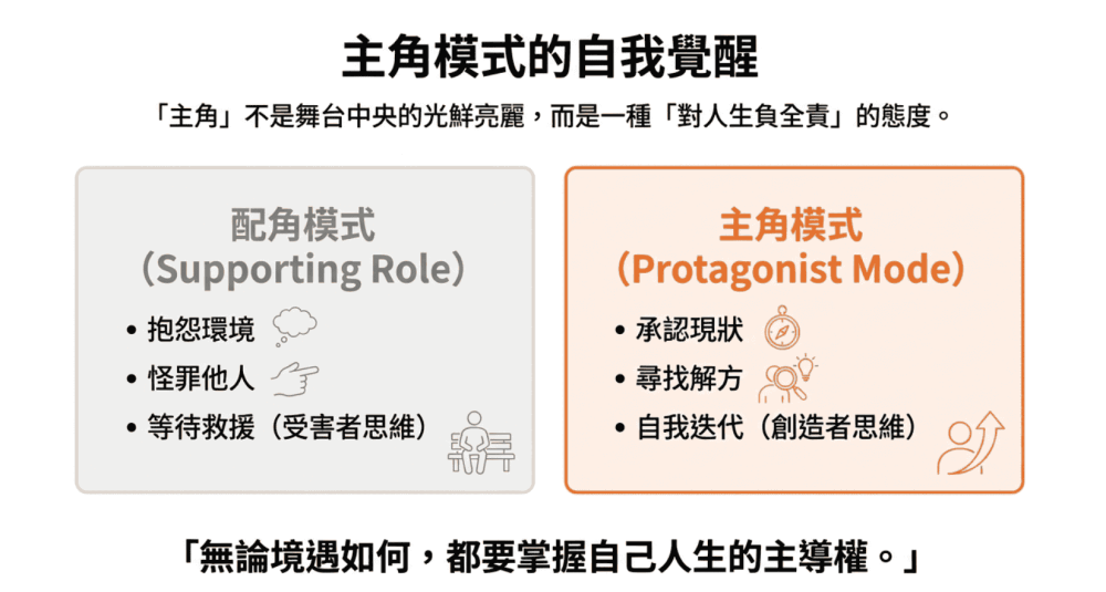為了對抗這種依賴心理,我們需要開啟「主角模式」,很多人對主角有誤解,以為主角就是站在舞台中央、光芒萬丈的成功人士。但書中定義的「主角模式」是一種心態,而非地位。