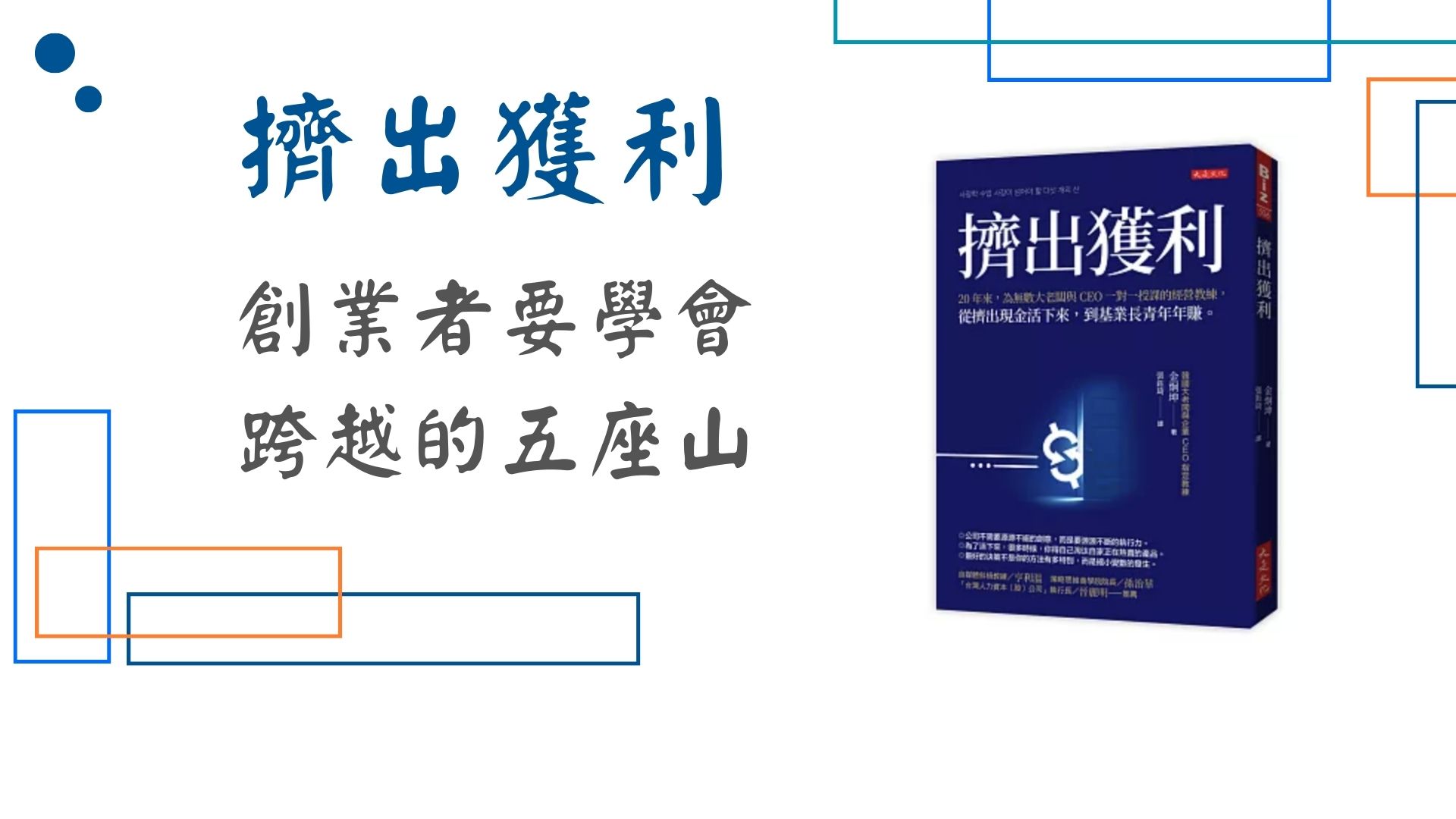 所以這本書會很適合剛起步的創業者尋找生存之道,也適合陷入瓶頸的企業主思考如何突破管理與自我的侷限。接下來我想要真對於《擠出獲利》中第二單元的五座山來跟你分享。