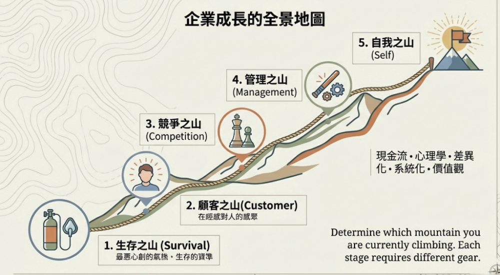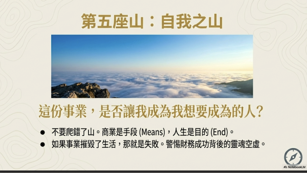 這座山的核心定義在於「事業與人生價值觀的對齊」。許多老闆在攀爬前四座山時,往往為了生存不得不妥協。