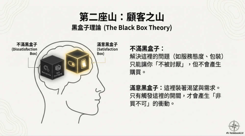 每個顧客心中都有兩個盒子 :一個是裝著渴望與需求的「滿意黑盒子」,另一個則是裝著疑慮與挑剔的「不滿黑盒子」。