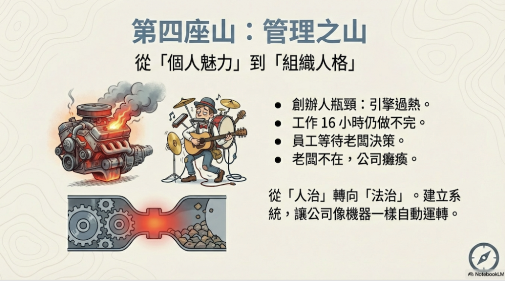 這時候公司的核心挑戰在於,必須從依賴「老闆個人魅力」,轉向建立「組織人格」 。