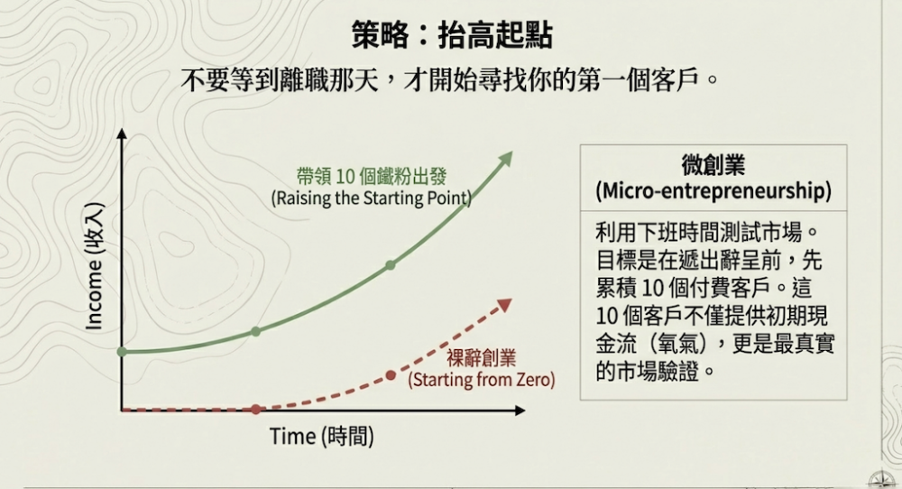 最聰明的做法是利用下班時間進行「微創業」或「試營運」。想像一下,如果你是帶著 10 個已經付費過的鐵粉客戶離職創業,和你兩手空空從零開始,兩者的生存機率是天壤之別。